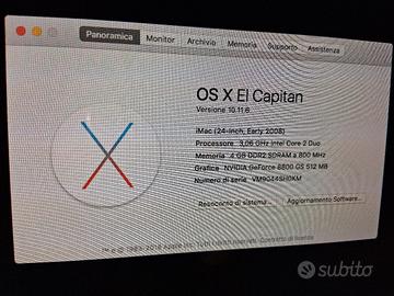 Processore Intel Core 2 Duo a 3,06 GHz, 4GB RAM DDR2, Hdd 1 TB. OSX 10.11.6 El Capitan. Perfette condizioni estetiche e funzionali. No mouse, no tastiera. Cavo di alimentazione. Peso 12kg ca.