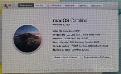Vendo iMac perfettamente funzionante e privo di qualsiasi difetto, completo di tutti i relativi accessori originali (tastiera, mouse, 6 pile ricaricabili e ricaricatore). Processore: quad-core i5 2.9 ghz; scheda video da 512 Mb: Ram 24 gb DDR3 da 1600 Mhz, HDD da 512 gb. Preciso che per rendere il pc più veloce si può tranquillamente installare una SSD esterna. Preferisco la consegna a mano in zona visto l’ingombro e la delicatezza dell’oggetto.