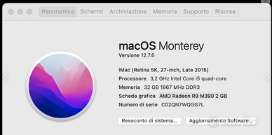 Vendo iMac 27" 5K (Late 2015), compreso di tastiera originale Apple (Magic Keyboard) e mouse originale Apple (Magic Mouse) e imballi originali. Il computer è perfettamente funzionante. SPECIFICHE TECNICHE POTENZIATE: Modello: Apple iMac (Retina 5K, 27-inch, Late 2015) Display: Retina 5K da 27 pollici (Risoluzione 5120 x 2880) Processore: Intel Core i5 3.2 GHz Ram: 32 GB 1867 MHz DDR3 Archiviazione: 1 TB SSD originale Apple ultra veloce (Prestazioni massime, non si tratta di Fusion Drive o SSD non originale) Scheda Grafica: AMD Radeon R9 M390 2 GB