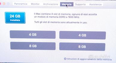 Vendo bellissimo Apple iMac con ampio display da 27 pollici (diagonale di circa 68 centimetri), modello Late 2012 (A1419). Il computer è in ottime condizioni, perfettamente funzionante e inizializzato, pronto per essere configurato dal nuovo proprietario. È una macchina solida e affidabile, ideale per il lavoro da ufficio, la navigazione, lo studio e l'intrattenimento multimediale. Specifiche Tecniche di rilievo: Display: 27 pollici (risoluzione 2560 x 1440), schermo ampio, luminoso e dai colori fedeli. Processore: Intel Core i5 quad-core a 2,9 GHz. Memoria RAM: Ben 24 GB (1600 MHz DDR3). Un quantitativo eccellente, ampiamente espanso rispetto al modello base, che garantisce un multitasking fluido anche con molte applicazioni e schede del browser aperte. Archiviazione: Doppia unità di archiviazione per unire velocità e immensa capienza. È presente un'unità Flash (SSD) da 121 GB per far sfrecciare il sistema operativo, affiancata a un capiente Hard Disk SATA da 1 TB (1000 GB) per conservare tutti i vostri documenti, foto e video. Scheda Grafica: NVIDIA GeForce GTX 660M con 512 MB di memoria dedicata. Sistema Operativo: macOS Catalina (versione 10.15.7). Connettività: 4x porte USB, 2x porte Thunderbolt, lettore di schede SD, porta Gigabit Ethernet per internet via cavo e jack audio. Condizioni estetiche: Il Mac è stato tenuto con estrema cura. Lo schermo non presenta difetti visibili e la scocca in alluminio è in ottimo stato generale, con i soli e normali, lievi segni del tempo sul retro.