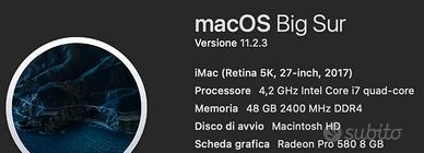 iMac usato per lavoro, ora inutilizzato per passaggio a Mac Studio. macOS Big Sur Versione 11.2.3 iMac (Retina 5K, 27-inch, 2017) Processore 4,2 GHz Intel Core i7 quad-core Memoria 48 GB 2400 MHz DDR4 Disco di avvio Macintosh HD Scheda grafica Radeon Pro 580 8 GB
