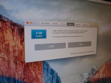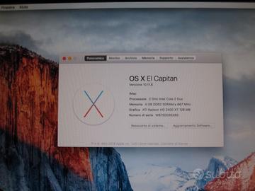 Vendo robusto e affidabile Apple iMac Apple iMac a1224 20" 7,1 Mid 2007 250GB HDD 4GB DDR2 Intel Core 2 Duo T7300 - 2.0 GHz con sistema operativo installato pronto all'uso MacOS X El Capitan 10.11.6 in ottime condizioni come da foto. Incluso Pacchetto LibreOffice, Garageband, Adobe photoshop, Adobe bridge, adobe acrobat, adobe illustrator, chrome, firefox, vlc e altri.