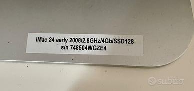 iMac 24 pollici, processore 2.8 GHz, SSD 128 Gb, RAM 4Gb. S.O. El Capitan. Vendo per passaggio a notebook. Condizioni eccellenti; unico difetto: una delle due casse built-in ha ceduto. Per cortesia, se non siete decisi nell’ acquisto, evitate di schiacciare “acquista” e poi farmi perdere 48 ore e potenziali vendite: vi segnalo. Grazie