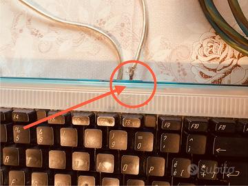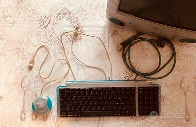 Mouse e tastiera: quelli che vedi sono originali Apple USB — il mouse tondo è soprannominato “Hockey Puck”.