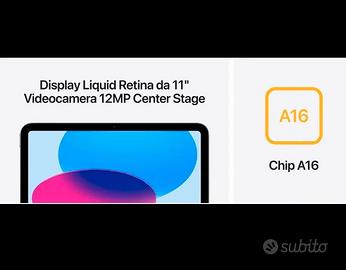 Vendo Apple iPad 11" (A16) Wi-Fi 128GB colore Silver Prodotto nuovo e originale acquistato aprile 2026 , mai aperto e mai utilizzato: la scatola è ancora sigillata e i sigilli sono perfettamente integri. (Posso mandare ulteriori foto e dare anche numero modello) Acquistato da Amazon con scontrino che verrà consegnato insieme al prodotto per la garanzia. Caratteristiche principali: display Liquid Retina da 11" chip Apple A16 memoria 128GB Wi-Fi 6 Touch ID porta USB-C fotocamera posteriore 12MP fotocamera frontale 12MP Center Stage Perfetto per chi cerca un iPad realmente nuovo, non ricondizionato e mai attivato.