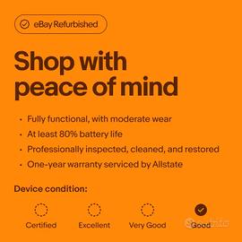 "Questo dispositivo è in BUONE condizioni estetiche e mostrerà graffi e/o graffi sul corpo e sullo schermo. È stato testato e ripristinato al 100% di funzionalità. Viene fornito in una scatola bianca con un caricabatterie generico (Sim Card non inclusa). Le batterie sono testate per mantenere una buona carica, ma potrebbero non avere le prestazioni di una batteria nuova".