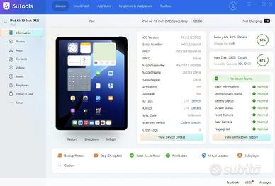 Tablet Apple in elegante colorazione Space Gray, dal design ultrasottile e moderno. Il dispositivo si presenta in perfetto stato estetico, con display ampio da 13 pollici e retro in alluminio ben conservato. Modello: iPad Air 13-inch (M2) 2024 Colore: Space Gray Display ampio da 13 pollici Fotocamera posteriore singola visibile Porta di ricarica USB-C Speaker laterali doppi visibili Connettori posteriori Smart Connector Display acceso e perfettamente funzionante Batteria al 94%, con soli 6 cicli di ricarica, come mostrato in foto Stato del prodotto: perfetto stato Stato dello scatolo: non presente