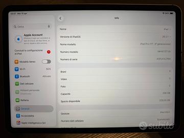 Vendo apple ipad pro 11” 3 generazione. Tenuto molto bene con cover ma ha due piccoli segnetti sul bordo, per il resto vetro e altro perfetto. Ha 256gb e anche l’opzione cellular , quindi completo per lavorare anche senza wi-fi. Lascio cover che e’ in buono stato. Non piu’ in garanzia ma tutto originale e mai andato in riparazione. Completo di caricatore.