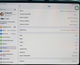 Vendo Ipad Pro M4, 256gb 13” wifi+cell, paragonabile al nuovo, batteria al 98% e 164 cicli di ricarica, completo di cover Apple a libro e pellicola sul display fin dal primo giorno d’uso dello stesso, fornito di imballaggio originale e copertura Apple Care+