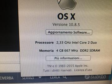macmini 2,1 cpu intel T7600 core duo 2 osX 10.8.5 con adattatore di corrente. garage band, ilife 11, photoshop cs6 installati. Lettore dvd/cd da revisionare Porta firwwire, lan, microfono, uscita audio, 4 porte usb, wifi e bluetooth