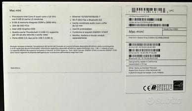 Vendo computer Apple Mac Mini acquistato ad ottobre 2020, ultimo modello con processore Intel e che quindi ci si può installare Windows direttamente senza virtualizzare. Monta un processore 3,6 ghz, 8 gb di ram, 256 gb di ssd pci-e, wi-fi, bluetooth, 4 Thunderbolt ecc..le caratteristiche complete le potete leggere sulla foto del posteriore della scatola. Le condizioni di conservazione sono pari al nuovo, senza il minimo graffio, perfettamente funzionante ed è stato usato molto poco. Lo vendo per passaggio a modello più recente. Disponibile scatola originale con tutti gli accessori, compreso il cavo di alimentazione originale, i manuali e lo scontrino d’acquisto. Possibilità di spedizione in tutta Italia. Per ulteriori informazioni e foto contattatemi pure. Prodotto originale Apple.