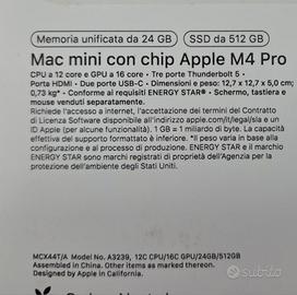 Vendo Mac Mini con processore M4 Pro, configurazione potenziata con 512GB di archiviazione SSD e 24GB di RAM.
