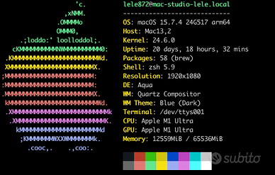 Potenza senza compromessi per Professionisti Vendo per passaggio a sistema superiore Apple Mac Studio con chip M1 Ultra, la workstation definitiva per creativi, editor video e sviluppatori. Grazie all'architettura UltraFusion, questo modello offre prestazioni incredibili, superando anche le configurazioni Mac Pro basate su Intel. Specifiche Tecniche Principali: Chip: Apple M1 Ultra (CPU 20-core con 16 performance core e 4 efficiency core) GPU: 48-core (ideale per rendering 3D pesante e montaggio video 8K) Neural Engine: 32-core per operazioni di machine learning avanzate Memoria Unificata: 64GB (larghezza di banda di 800GB/s) Archiviazione: 1TB SSD ultra-veloce Porte Frontali: 2x Thunderbolt 4, 1 scanalatura scheda SDXC Porte Posteriori: 4x Thunderbolt 4, 2x USB-A, 1x HDMI, 1x 10Gb Ethernet, Jack cuffie 3,5 mm Condizioni del Prodotto: Stato Estetico: Eccellente, pari al nuovo. Non presenta graffi, ammaccature o segni di usura. Stato Funzionale: Perfetto al 100%. Il computer è stato utilizzato in ambiente professionale (studio di registrazione/montaggio) privo di fumo e polvere. Software: Verrà consegnato formattato con l'ultima versione di macOS disponibile, pronto per la configurazione iniziale. Contenuto della Confezione: Mac Studio M1 Ultra Cavo di alimentazione originale Perché acquistare questo Mac Studio? L'M1 Ultra è ancora oggi una delle macchine più silenziose e potenti sul mercato. Gestisce flussi di lavoro multipli in 4K e 8K senza che le ventole diventino mai rumorose. È l'investimento perfetto per chi cerca una workstation affidabile che durerà per molti anni a venire. Informazioni su Spedizione e Pagamento: Spedizione: Spedito tramite corriere espresso DHL con imballaggio professionale e assicurazione inclusa nel prezzo per la massima tranquillità. Pagamento: Si accettano i metodi di pagamento sicuri. Ritiro a mano: Roma