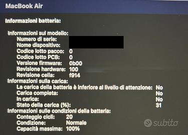 Vendo Apple MacBook Air 13" colore Galassia RAM 8GB SSD 256GB comprato anni fa e mai usato, ha solo 20 cicli di carica e la batteria è al 100% è come nuovo non ha il minimo graffio/segno nemmeno sulla tastiera. vendo per completo inutilizzo. completo della sua scatola originale con suo caricabatteria e cavo originale.