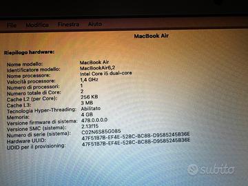 MacBook Air 13” (Early 2014) – Ottime condizioni, batteria ok Descrizione: Vendo MacBook Air 13 pollici (inizio 2014), tenuto bene e perfettamente funzionante. Caratteristiche principali: •Processore Intel Core i5 dual-core 1,4 GHz •Memoria RAM 4 GB DDR3 1600 MHz •Grafica Intel HD Graphics 5000 (1536 MB) •Schermo da 13,3” (1440x900) •Archiviazione SSD veloce da 128 GB •macOS Big Sur 11.7.10 installato •Batteria in buone condizioni, solo 287 cicli – capacità residua 6669 mAh •Alimentatore originale incluso ✅ Ottimo per navigazione internet, mail, smart working leggero, streaming e uso scolastico. 💡 Pronto all’uso, subito disponibile. Prezzo leggermente trattabile