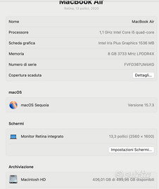 Vendo pc portatile Apple Mac Book Air 13 pollici, anno 2020.