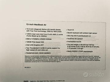 Apple MacBook Air 13" Retina (2019) con Intel Core i5 da 1.6 GHz tenuto con estrema cura. -.-.-.-.-.-.-..-.-.-.-.-.-.-.- .-.-.-.-.-.-.-.- Schermo: Retina 13.3 pollici (2019) Memoria RAM: 8 GB Archiviazione SSD: 128 GB Cicli di ricarica della batteria: 298 Condizione batteria: NORMALE Tastiera retroilluminata Colore: Oro (rosa) / Rose Gold Scatola originale