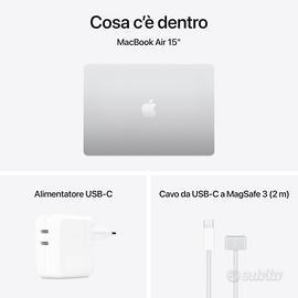 OFFERTISSIMA !!! Causa acquisto sbagliato vendo: Apple Portatile MacBook Air 15'' con chip M4 (2025): progettato per Apple Intelligence, display Liquid Retina da 15,3'', 16GB di memoria unificata, 256GB di archiviazione SSD, Touch ID; Argento IPERLEGGERO. EXTRAVELOCE. — Con il chip M4, MacBook Air ti fa sfrecciare in scioltezza fra i tuoi impegni e le tue passioni. Grazie a Apple Intelligence,* una batteria che dura fino a 18 ore* e un design dalle dimensioni ultraridotte, puoi fare di tutto, ovunque sei. CON I SUPERPOTERI DEL CHIP M4 — Il chip Apple M4 ti offre ancora più velocità e fluidità in tutto quello che fai: te ne accorgerai quando lavori con più app insieme, fai video editing o ti immergi in giochi dalla grafica complessa. PROGETTATO PER APPLE INTELLIGENCE — Apple Intelligence è il sistema di intelligenza personale che rende più facile scrivere, creare e fare tutto ciò che vuoi. E grazie a funzioni di ultima generazione per la tutela della privacy, hai la certezza che nessuno potrà accedere ai tuoi dati, nemmeno Apple.* FINO A 18 ORE DI BATTERIA – MacBook Air ti dà performance incredibili anche quando non è collegato alla corrente.* UN DISPLAY DA PAURA – Il display Liquid Retina da 15,3" supporta un miliardo di colori.* Foto e video prendono vita, grazie all’elevato contrasto e alla nitidezza dei dettagli. E anche il testo è ultradefinito. FATTI VEDERE E SENTIRE ALLA GRANDE — Videocamera 12MP Center Stage, tre microfoni e quattro altoparlanti con audio spaziale: una gioia per gli occhi e per le orecchie. SI CONNETTE A TUTTO — MacBook Air ha due porte Thunderbolt 4, una porta di ricarica MagSafe, un jack per cuffie, il Wi Fi 6E* e il Bluetooth 5.3. E ti permette di collegare fino a due monitor esterni. MACOS METTE IL TURBO ALLE APP – Quelle che usi di più, comprese Microsoft 365 Copilot, Adobe Creative Cloud e Google Workspace, etc.