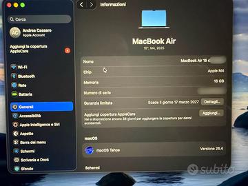 Ricevuto in regalo e attivato il 17 marzo 2026. Utilizzato solo per provarlo. Completo di scatola, alimentatore con doppia porta da 35 watt, cavo di carica mai usati. Colore mezzanotte. Versione con processione M4 completo, quello con 10 core di GPU e non 8 come il MacBook Air da 13 pollici. Naturalmente, privo di ogni segno di usura. Praticamente nuovo. Spedisco in tutta Italia.