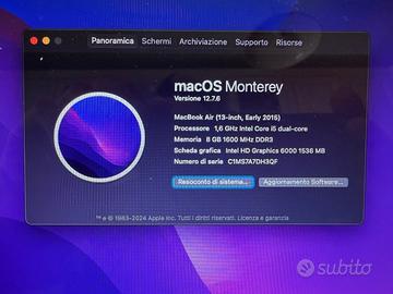 MacBook Air 2015 in ottime condizioni. - Ram 8gb - processore Intel i5 1.6 GHz - schermo 13’’ - disco 256 gb - TASTIERA AMERICANA - cavo alimentatore sia Italia che Regno Unito - macOS Monterey 12.7.6 Formattato e pronto all’uso. Non spedisco.
