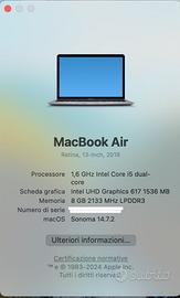 Vendo Apple MacBook Air 13 Pollici.1,6 Ghz Intel Core i5 quad-core. 8 Giga di Ram. SSD da 128 Giga. Completo di scatola originale e carica batteria.