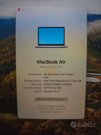 Apple Macbook Air 13". Ottime condizioni, solo un piccolissimo segno (foto 9) dovuta ad una vecchia cover che lo ha graffiato, ma è davvero minimo e piccolo segno di battitura che non comporta il funzionamento (ultima foto). Compreso di scatola (non l'avevo al me momento delle foto), carica batterie e cover a libretto. Informazioni su sistema e capacità in foto. Per altre foto, scrivetemi.