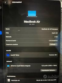Apple 2022 PC Portatile MacBook Air con chip M2: display Liquid Retina 13,6'', 8GB di RAM, 256GB di archiviazione SSD storage, tastiera retroilluminata; color Mezzanotte