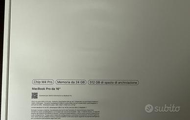 Vendo MacBook MacBook M4 Pro 16” 24GB RAM 512GBSDD nuovo mai aperto, vendo per regalo non gradito. Non scambio, solo ritiro a mano. No affaristi