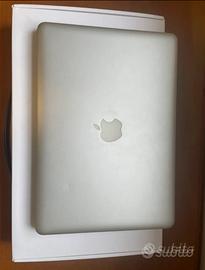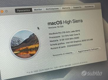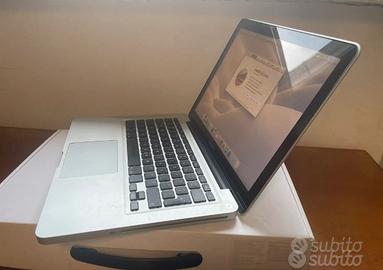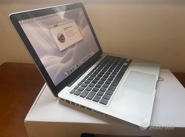 MacBook Pro 13 I5 2.4 ghz., 8 gb. RAM - ssd 256 gb, unico proprietario acquistato nel 2011, tastiera in inglese ma eventualmente si può appoggiare una tastiera in silicone con lettere in italiano, in buone condizioni estetiche come da foto, funzionante, fermo da un po’ di tempo per inutilizzo, batteria con durata di circa 1 ora, avvio un po’ lento ma poi abbastanza reattivo.
