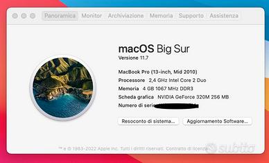 Vendo Apple MacBook Pro da 13" mid 2010. Vendo per inutilizzo, perfettamente funzionante completo di carica batterie. Montato con la doppia predisposizione del ssd, attualmente ne contiene uno da 120gb, è stato rimosso il superdrive DVD. Come da foto allegate attualmente è installato Mac Os 11.7 Big Sur, la massima versione di os per questo modello sarebbe Hight Sierra, nel caso vorreste l'originale posso ripristinarlo ma non avrebbe alcun senso poichè limitante. Spedisco ma preferisco la consegna a mano. Astenersi Scambi e perdi tempo. Solo per utenti consapevoli.
