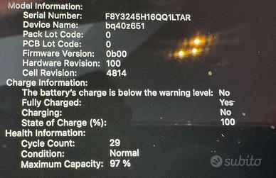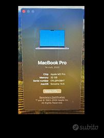 Vendo Apple MacBook Pro quasi inutilizzato. Acquistato nel luglio 2023, solo 29 cicli di ricarica. Prezzo all'epoca 3459,00 EUR.