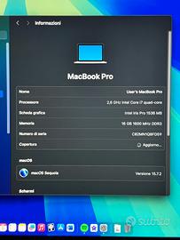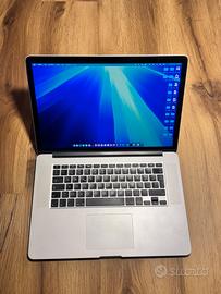 Vendo per passaggio a modello superiore, potentissimo MacBook Pro 15.4 pollici (Fine 2013) con Display Retina. È una macchina professionale ancora oggi velocissima, ideale per editing video, musica (DJ/Produzione) o grafica, grazie ai 16GB di RAM e al processore i7. SPECIFICHE TECNICHE: Processore: Intel Core i7 Quad-Core a 2,6 GHz (Potente e affidabile). RAM: 16 GB (Gestisce tranquillamente molte app aperte insieme). Disco: SSD da 512 GB (Molto spazio e massima velocità). Schermo: Retina 15.4" ad altissima risoluzione (colori perfetti). Grafica: Doppia scheda video (Intel Iris Pro + NVIDIA GeForce GT 750M). CONDIZIONI: Estetica: Tenuto benissimo, scocca integra e schermo senza graffi. Funzionamento: Perfetto in ogni sua parte. Tastiera italiana originale. Batteria: Stato buono, tiene bene la carica per l'uso quotidiano. VANTAGGI DI QUESTO MODELLO: A differenza dei modelli nuovi, questo MacBook ha tutte le porte integrate: USB standard, HDMI per collegarlo alla TV, lettore di schede SD e il mitico caricatore magnetico MagSafe. Non avrai bisogno di costosi adattatori! INFO E CONSEGNA: Il computer viene fornito formattato e pulito, pronto all'uso con l'ultima versione di macOS supportata. Incluso alimentatore originale Apple MagSafe 2.