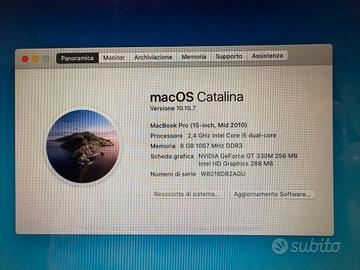 Vendo Macbook pro da 15", mid 2010 con OS 10.15.7 Catalina, dotato di CPU Intel Core i5 2,4GHZ, 8GB di RAM disco solido SSD da 256GB, scheda grafica NVIDIA GeForce GT330M 256MB in ottimo stato e con batteria sostituita nel 2024, alimentatore originale incluso