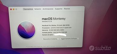 Apple macbook pro mid 2015 modello A1398 EMMC 2909 Schermo 15,4 pollici Processore i7 2,8 Ghz Disco 1TB SSD Ram 16 Gb Scheda video Intel Iris Pro 1536 Mb