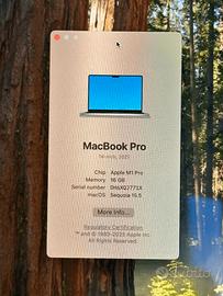 Vendo MacBook Pro 14” (A2442, M1 Pro) Processore 8-core, GPU 14-core, 16 GB di memoria unificata, SSD da 512 GB. Modello base in ottime condizioni, usato con cura. Funziona perfettamente. Ideale per lavoro, studio, design o sviluppo.