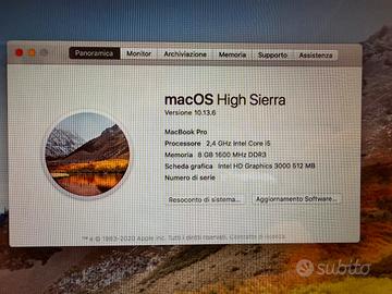 Vendo Apple MacBook Pro in ottime condizioni equipaggiato con CPU intel core i5 2.4gHz , 8 giga di Ram , 256 giga di SSD Samsung, batteria in buono stato. Viene fornito con MacOs High Sierra precaricato e caricabatteria originale.