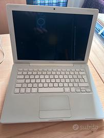 MacBook bianco Core 2 Duo, anno 2006. HD 160 GB, memoria 2 GB. Il disco è stato cancellato, va formattato da zero. Discrete condizioni generali, batteria non originale, niente cavo di alimentazione.
