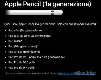 Vendo Apple Pencil di quarta generazione, perfettamente funzionante in tutte le sue caratteristiche. La penna funziona in modo ottimo: • Sensibilità alla pressione • Sensibilità all’inclinazione La batteria è ancora ottima. Compreso nell’acquisto: • Scatola originale • Adattatore per ricarica tramite cavo Il cappuccio è stato sostituito ed è nuovo. Nell’ultima foto dell’annuncio sono visibili gli iPad compatibili. Per qualsiasi domanda mi si può contattare.