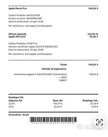 Vendo Apple Pencil Pro in condizioni pari al nuovo, usato solo 2-3 volte. Acquistato a dicembre scorso a 149€, con scontrino. Perfettamente funzionante, si ricarica e funziona senza alcun problema. Compatibile con iPad Pro M4 / M5 e iPad Air M2 / M3. Prezzo:110