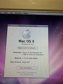 Vendo ad appassionati e collezionisti Computer Apple Power Mac G4 MDD del 2003 in buono stato e perfettamente funzionante, con le seguenti caratteristiche: - DOPPIO processore Power PC G4 da 1.25 GHz; - 1.75 GB di RAM DDR - nr. 3 dischi meccanici; - nr. 1 unità SSD da 120 GB con sistema operativo principale; - nr. 1 unità ottica per lettore e masterizzatore DVD; - scheda originale WI-FI Air Port; - monitor Apple studio display da 15 Pollici; - tastiera Apple pro keyboard; - Apple pro Mouse; - altoparlanti originali Apple speakers; - scheda di espansione PCI usb 2.0; - scheda grafica ATI Radeon 9000 Pro; - attualmente sono caricati 3 sistemi operativi: - Mac OS X 10.5.9 "Sorbet Leopard" con diversi aggiornamenti non ufficiali, avviabile da unità interna veloce SSD; - Mac OS X 10.4.11 avviabile da dedicato disco meccanico; - Mac OS Classic 9.2.2 avviabile da dedicato disco meccanico; - sono preinstallati diversi software professionali come Office 2008, Adobe CREATIVE SUITE, Logic Pro, Final Cut Pro, Soundtrak, DVD Studio Pro, Toast 8 Titanium, iWord'09 ecc.. - sono inclusi cavo prolunga originale apple per tastiera; - cavo firewire 400; Posso aggiungere a parte per chi interessa; - Monitor LG da 22 Pollici perfettamente funzionante a 70€ - Scanner fotografico EPSON Perfection 1670 perfettamente funzionante a 50€ per qualsiasi info o foto aggiunive sono a disposizione; considerati i pesi e le dimensioni preferisco consegna a mano zona Treviso e Venezia.