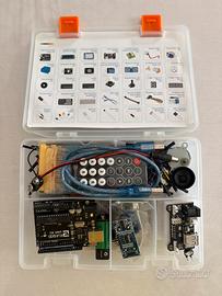 Contenuto: •Scheda UNO R3 compatibile Arduino •Breadboard (come da foto) •Kit completo di componenti (sensori, cavi, LED, resistenze, ecc.) •CD con tutorial, codici e librerie •Valigetta originale