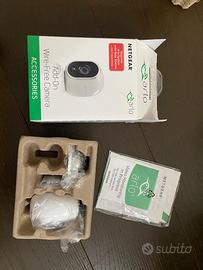 Kit di videosorveglianza con base VM 3500 della Arlo. Sono comprese tre webcam a batteria, una base e tre gusci bianchi, oltre ad un alimentatore “non ufficiale” che alimenta la telecamera con la rete elettrica. Sono compresi inoltre gli accessori presenti nella fotografia. Il kit era funzionante fino a qualche mese fa. Prezzo trattabile