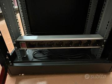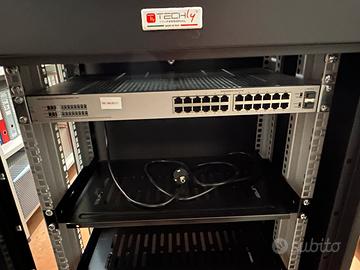 Armadio rack Techly Professional a tre ripiani (manca il fianco sinistro) + switch HPE OfficeConnect 193OS a 24 porte + multipresa 8 porte. Dimensioni armadio: Larghezza 60 cm. Profondità 40 cm. Altezza 131 cm.