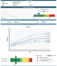 La calcificazione arteriosa è una un paramentro totalmente negletto ma è una delle principali cause di morte; infarto, ictus, demenza, sono patologie associate alla calcificazione arteriosa. Questo è un apparecchio computerizzato di ultima generazione che valuta l'arterial stiffness (rigidità arteriosa). A seconda del grado di calcificazione, si può valutare l'intervento chirurgico o piuttosto procedere con la decalcificazione con rimedi naturali o EDTA. E' ancora il produzione ed ha assitenza, pagato 4500€, perfettamente funzionante. Vendita da privato. Uno dei 3 manicotti a disposizione ha un piccolo braccetto di plastica difettoso, ma è usabile anche così oppure facilmente sistituibile con pochi €. Prezzo non trattabile, ma compreso un corso di 2 ore presso il mio Ambulatorio di Udine e la misurazione dell'acquirente. Imparate un mestiere per tutta la vita!!