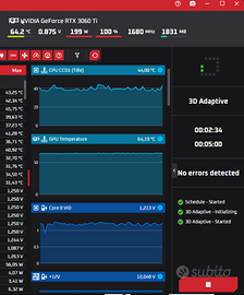 Vendo per passaggio a categoria superiore scheda video NVIDIA GeForce RTX 3060 Ti (8GB VRAM). La scheda è stata utilizzata esclusivamente per gaming leggero (no mining, no overclock estremo). Caratteristiche Principali: Prestazioni: Perfetta per giocare a 1080p con refresh rate alto o 1440p con dettagli elevati. Tecnologie: Supporto completo a Ray Tracing e NVIDIA DLSS (fondamentale per i titoli più recenti). Stato: Perfettamente funzionante, temperature ottime sotto carico, silenziosa. Uscite: 3x DisplayPort 1.4a, 1x HDMI 2.1 (supporta 4K/8K). Completa di scatola originale. Garanzia scaduta. Allego foto anche del benchmark effettuato con OCCT e dei sensori analizzati con HWiNFO64. Vendo a mano anche in Monza e Brianza e Milano centro.