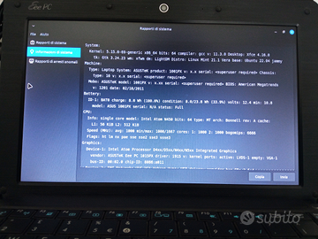 CPU: Intel Atom N450 frequenza 1,66 GHz, Hard Disk: 250 Gb, Memory card SdHc classe 10 da 32 GB, Ram 2 GB DDR2, Lettore Memory card, 2 Porte USB 2.0 , Uscita VGA, WiFi, Porta ethernet, Schermo: 10 pollici 1024x600, Sistema Operativo: Linux Mint Xfce 21.1 x64.