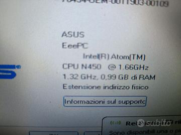 Mini PC portatile Asus EEEPC 1001 Px, Windows XP con licenza, Intel atom N450 @1.66ghz 1.32 GHz ,0,99 GB Ram con caricatore. 26 X 18 cm