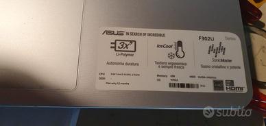 Vendo per inutilizzo ASUS VivoBook F302U IN BUONO STATO E FUNZIONANTE, batteria da sostituire Intel® Core™ i3-6006U 2.3 GHz Display 13,3" HD 1366x768 4 GB DDR Scheda grafica NVIDIA GEFORCE 920 MX SSD 24 GB + 500 GB HDD Intel® HD Graphics 520 Display 13.3" 1366 x 768 Pixel Retroilluminazione a LED WiFi 4 , 802.11b, 802.11g, (802.11n)+ Bluetooth 4.0 Batteria presente ma non tiene Alimentatore Windows 10 pro