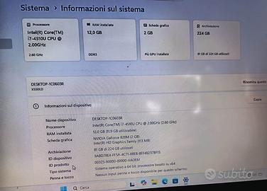 Ricondizionato con disco SSD vendo Notebook, LapTop, Pc, Computer Portatile ASUS VivoBook F550L - Intel Core i7 4510U 2,0 Ghz / 3,1 Ghz - 12 GB Ram DDR3 - SSD KingStone da 240GB - 15.6" HD LED - NVIDIA GeForce GT820M con 2 GB dedicati - DVD/RW - HDMI - USB 3.0 - Windows 11 Home 64Bit ultima versione 25H2, 64 bit installato con utenza di amministratore senza password o PIN. Intallato anche il Pacchetto Office (word excel powerpoint ecc. ecc) licenziato, Acrobat Reader per leggere i pdf. Molto veloce e performante grazie al core i7 al disco SSD e a ben 12Gb di Ram! Adatto per il Gaming leggero, ottimo per rendering video, modellazione 3d (Autocad), l'ufficio, per la didattica a distanza o per l'uso domestico. Batteria esterna da sostituire perchè esausta (nuova si trova a 20euro circa). Caricabatterie compreso. Qualche segno di usura nella scocca, nessuna rottura, display con alon bianchi visibili su sfondo bianco (vd. figura 2). Funzionante al 100%. Tastiera Italiana QWERTY Peso 2.3 Kg Schermo: 15,6" HD (1366x768) Scheda grafica: NVIDIA Gefroce GT820M con 2 GB dedicati. DVD/RW, HDMI, Wi-Fi, webcam, 1 x USB 3.0, 2 x USB 2.0, VGA, Ethernet, lettore di schede SD Consegna a mano nella città di Siena. Possibilità di scambio su Arezzo, Firenze, Prato, Pistoia. Col servizio Tuttosubito faccio spedizione in tutta Italia. Non accetto proposte d'acquisto, ci mettiamo d'accordo sul prezzo e faccio io l'offerta valida per 48ore. Vendita fra privati con la formula visto e piaciuto e con esclusione della garanzia. Tel. 3501333975