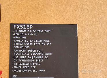Asus Tuf Dash F15, proc Intel I7 11 th Generation, Ram 8 Gb, scheda video NVIDIA GeForce RTX 3050, SSD 512GB, Display 15,6" FHD 144Hz. tastiera retroilluminata. pari al nuovo usato solo alcune ore. scatola integra. Pari al nuono
